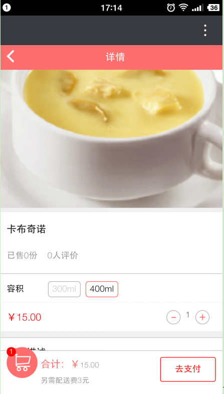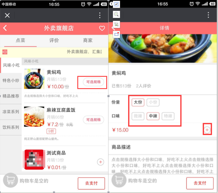 进入店铺之后有设置规格的菜品可以明确显示可选规格,点击可选规格跳转到另一个页面你可以根据自己事先设置的商品规格属性选择大小份选择口味,然后点击加号放进购物车。这个功能可以说是我们8.0版本更新的一大亮点。