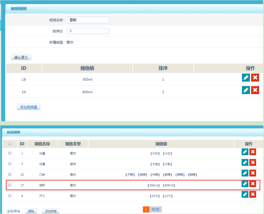 比如说咱们添加饮料的容积吧,就添加个300ml和400ml吧。点击添加规格以后呢,咱们编辑好容积就像下面这样