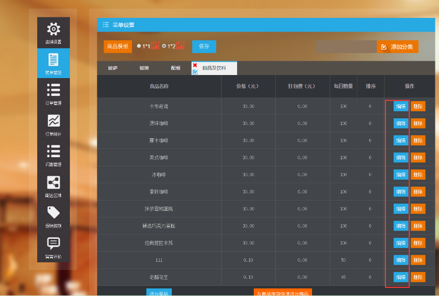 那么,我们来看一下应用到店铺里面应该怎么办吧。首先你找到一家商户后台,进到菜品管理,选中一个菜品,点击编辑就像下图这样