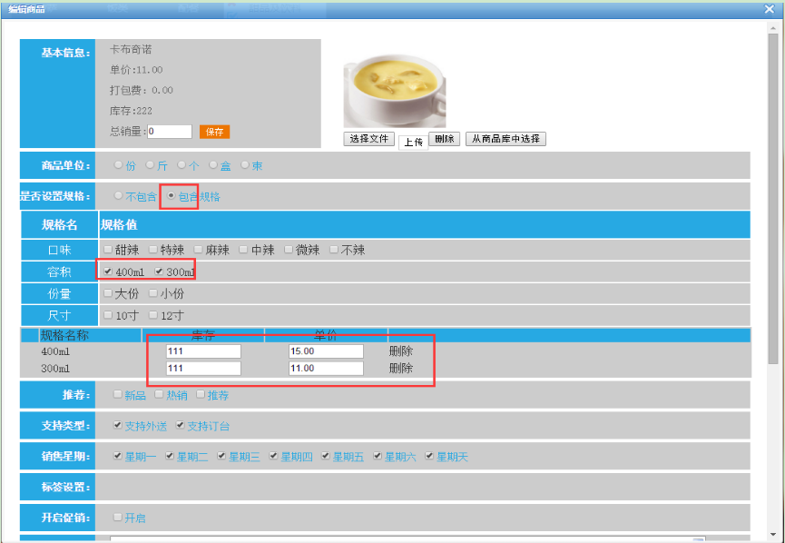 重庆安菲科技有限公司开发的安菲外卖网上订餐系统,专注外卖软件的开发已经有两年多的经验了,期间经过8次升级,自从15年团队壮大,更新的频次更是大幅度的增加,做到了一些同行所没有的突破,今天就给大家介绍其中一种我们跟同行的竞争优势的一方面----商品的规格属性。
