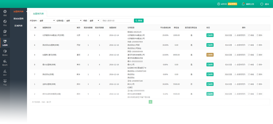 购买安菲配送系统可以添加多城市加盟商,加盟商可以添加区域配送站,配送站可以管理配送员,更多城市的加盟不断扩展配送业务!