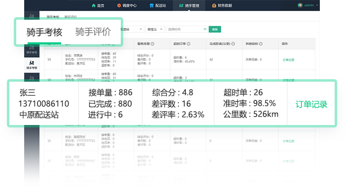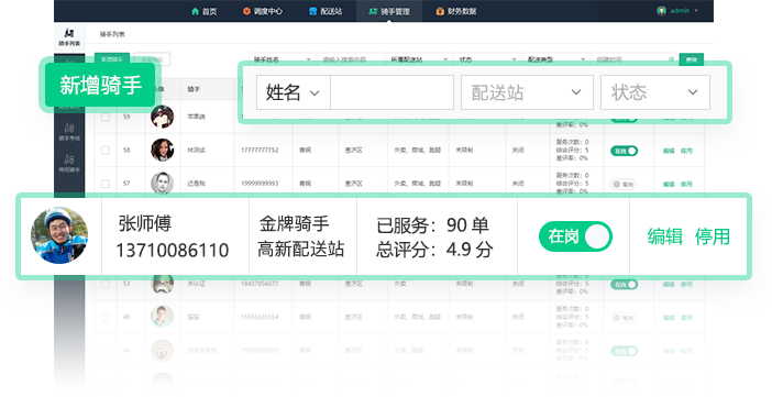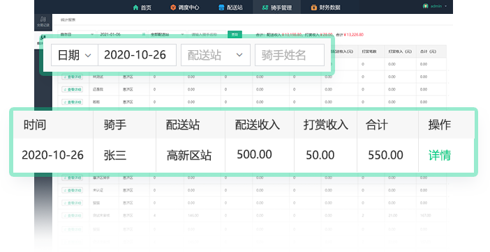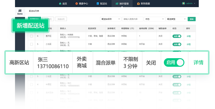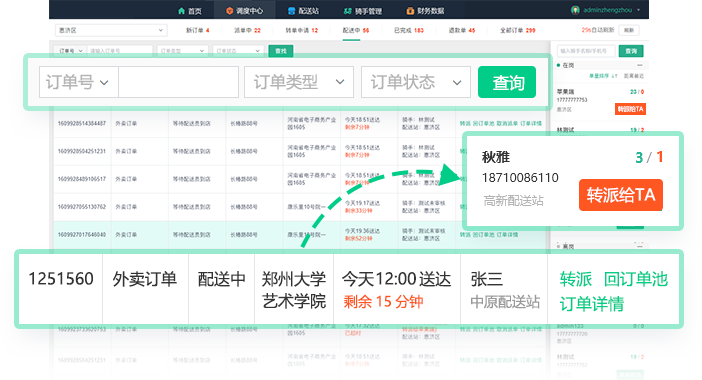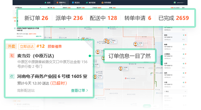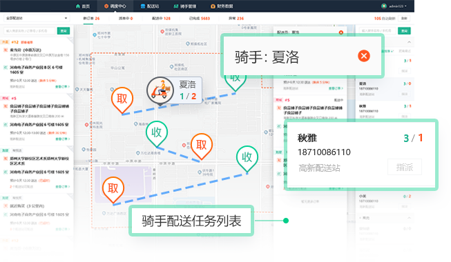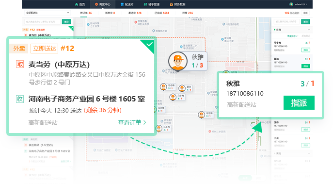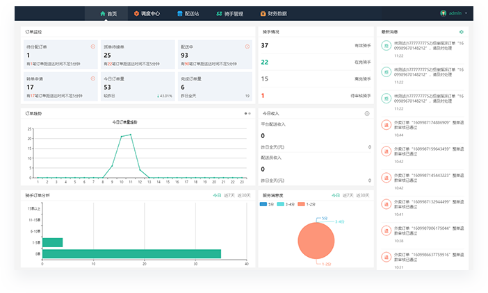 配送调度管理后台可实时监控平台订单状态和骑手位置,进行全局监控、协调派单,支持不同配送站设置不同派单方式,多维度统计分析配送订单数据,资金账户明细一目了然,方对运营人员对账结算