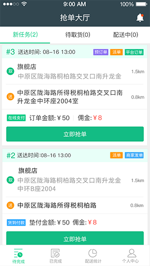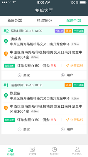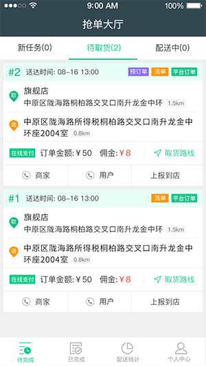 以往的配送端APP只是简单文字显示配送路线,使得配送元还要另外打开地图查看位置,增加负担。配送配送员APP不仅有取送货地址文字显示还增加了地图配送路线,距离更直观、更方便!